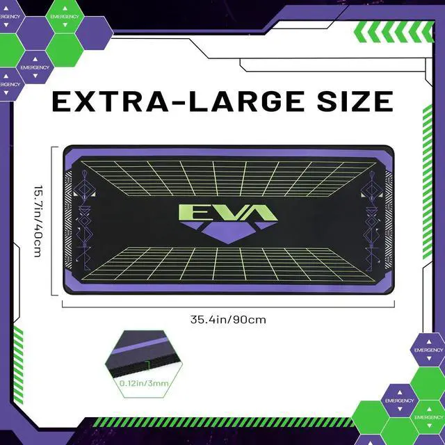 Unique Anime Design Inspired by Neon Genesis Evangelion, this mouse pad boasts a bold "EVA" logo and tech-grid lines, capturing the anime's sci-fi flair. A fan essential, it stands out as a uniquely themed accessory. ^^ Premium Material & Precision Performance This gaming mouse pad has an ultra-smooth high-density fabric surface and a non-slip rubber base, enabling friction-free gliding and precise tracking. It stays stable during intense use, making it ideal for any gaming scenario. ^^ Spacious Operation Area At 35.4" x 15.7", this large mouse pad allows unrestricted mouse movement, fits various usage styles, and enhances efficiency to meet diverse needs.