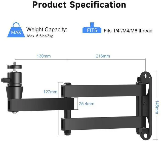 UNIVERSAL COMPATIBILITY Supports a wide range of projectors, digital cameras, camcorders, SLRs, and surveillance cameras with standard 1/4", M4, M6 screw mounts. Holds devices weighing up to 6.6 lbs, making it ideal for most small to medium-sized projectors. ^^ QUICK & EASY INSTALLATION Comes with all necessary mounting hardware and step-by-step instructions for hassle-free setup. It is suitable for walls made of concrete, brick, or wood. Simply drill two holes in the wall, secure the bracket, attach the universal head, and