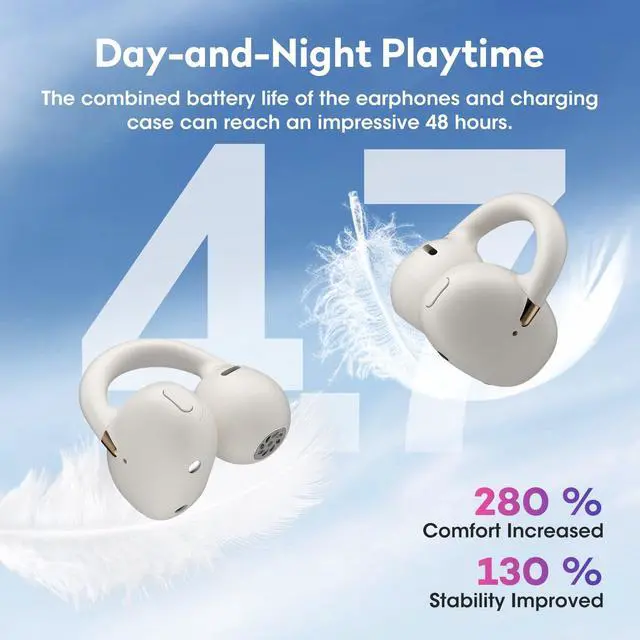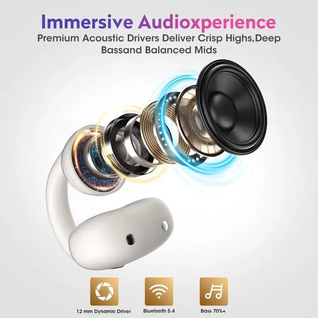 ^^ STUDIO SOUND MEETS ZERO LAG (12mm Dual Drivers & Bluetooth 5.4 ) 12mm titanium drivers deliver rich bass without sacrificing awareness. Bluetooth 5.4 + 35ms low-latency mode ensures perfect sync for movies and competitive gaming. ENC keeps calls crystal clear in noisy gyms or windy outdoors. ^^ SWEATPROOF GRIP FOR YOUR TOUGHEST WORKOUT (IPX6 & Secure Clip) The clip is engineered with 4-point support to lock securely during HIIT, sprints, and heavy lifts. IPX6 sweatproof + physical buttons work reliably with sweaty hands. Built for the grind. ^^ 40-HOUR FREEDOM & 5M+ COMMUNITY TRUST 6.5 h continuous playtime extends to 40h with charging case.