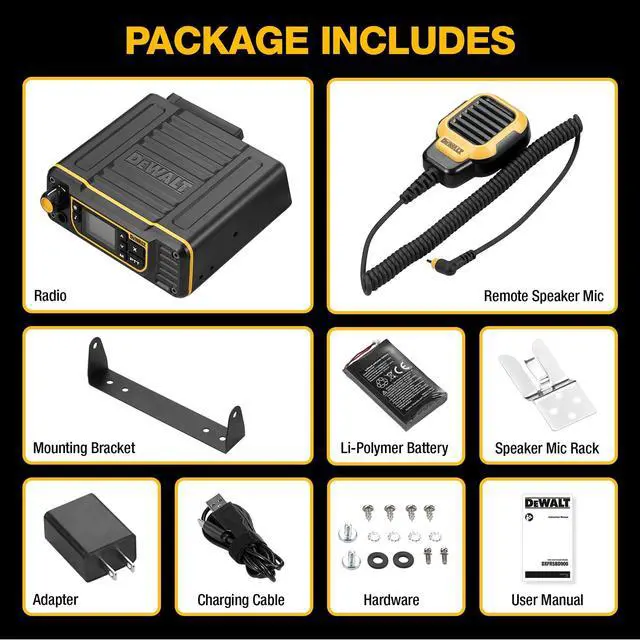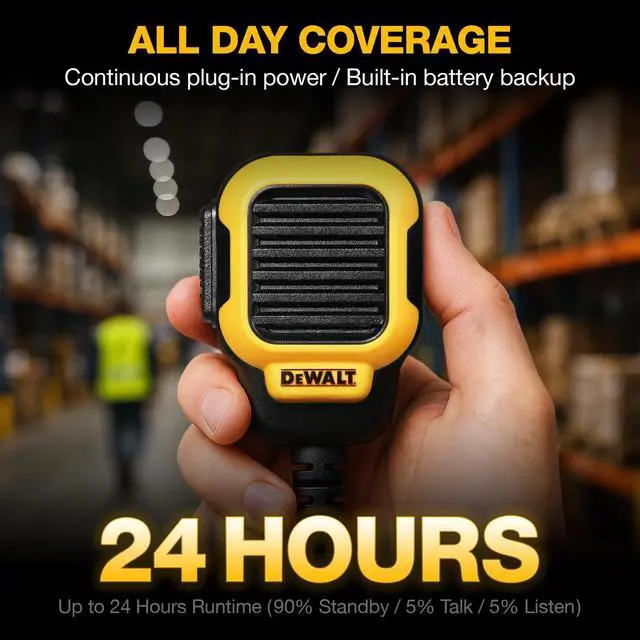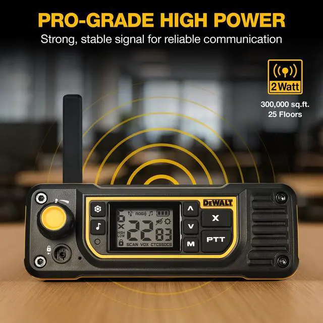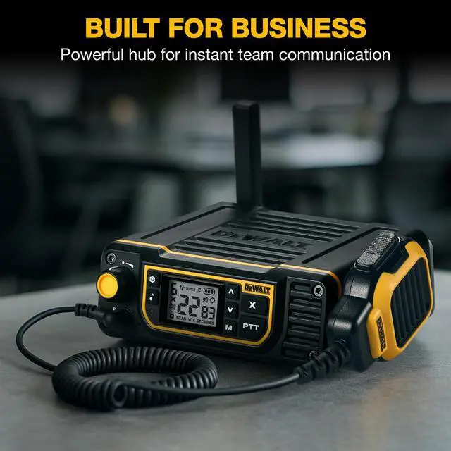 The DEWALT DXFRSBD900 base station business radio serves as your team's central communication command. Designed for busy workforces, it delivers two watts of RF output with up to three hundred thousand square feet of facility-wide coverage, keeping the entire team reachable from a single fixed point. Continuous plug-in power with up to twenty-four hours of built-in battery backup ensures the base station never goes dark, even during a power disruption. CommandCall broadcasts urgent messages to every handheld in the fleet with a single button press, eliminating the need for repeated transmissions. QuickClone wirelessly transfers channel and privacy code settings across all radios in the fleet without cables or additional software.