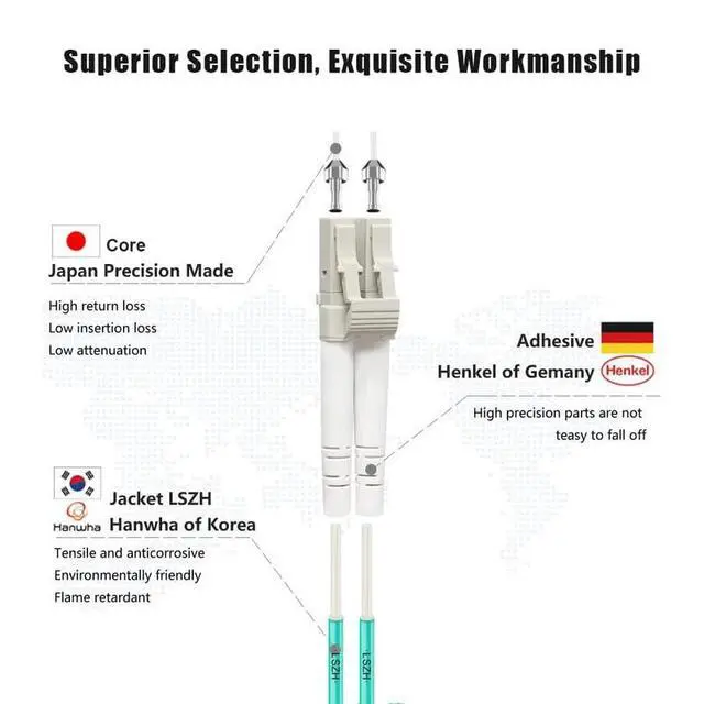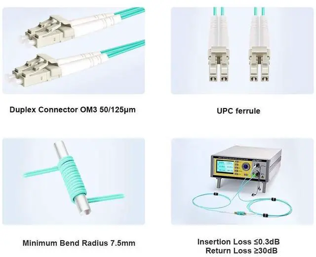 Bandwidth is 2000 MHzkm @850nm. ^^ 7.5 mm Minimum Bend Radius - High Rated 50/125um Fiber and Cladding, which is Insensitive to bending, easy peeling, easy welding, ensures small optical loss and stable transmission (insertion loss 0.3 dB, return loss 30dB. ), Ideal for SAN network cabinets that require 20 or more bends in the cabinet or high-density installations with cables crammed into an extremely small footprint. ^^ Construction Design - LSZH environmentally friendly Jacket; Adjustable connector clips allow individual fiber access; Embossed A/B position labels on the duplex clip and jacket tag rings labeled 1 & 2 provide quick identification of Tx and Rx when installing, testing, and troubleshooting equipment connections; UPC polish and Japan made zirconia ceramic ferrules with high return loss, low insertion loss, and low attenuation features, provide precise alignment to ensure the signal integrity.