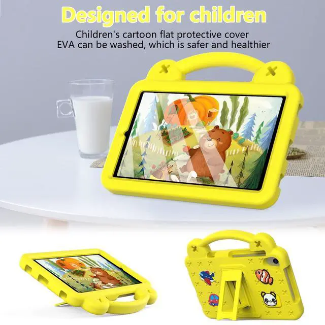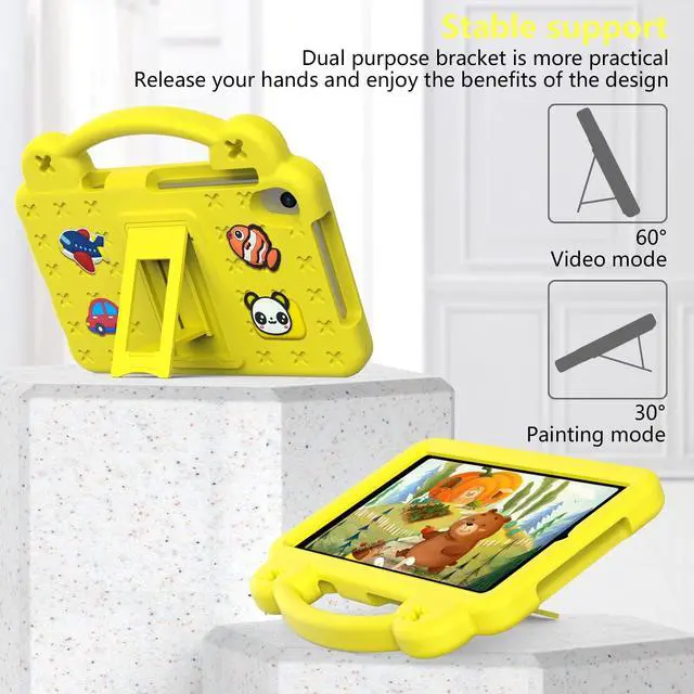 (Note: the product does not contain screen protector) ^^ [Cute DIY Design] There are some cute cartoon doll on the back, you can insert them into the holes on the back. ^^ [Sturdy Stand & Shoulder Strap] The built-in PC stand firmly supports the tablet, allowing you to watch videos comfortably. The shoulder strap allow you to carry the tablet easily. ^^ [Non-slip Handle] Portable handle, elegant design, allows children to take out the tablet easily.