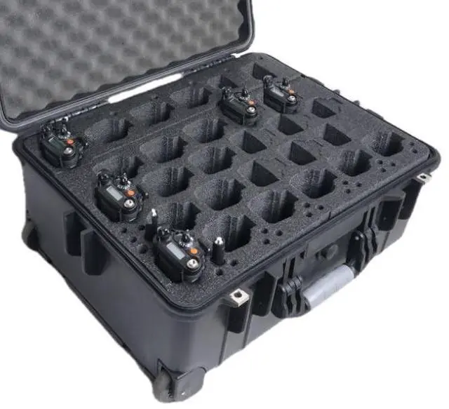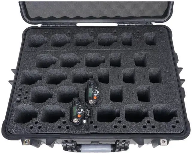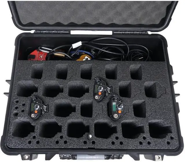 Case fits Quantity 28 Motorola APX 6000 Radios (with or without their plastic belt clip holsters) plus 28 Antennas ^^ The back row of radios can be removed to open up the area for cords, accessories, or even a 6-bank charger! ^^ Tilt wheels and Extension Handle for easy transport. 100% Waterproof (IP67) & Dustproof. Built-in pressure release valve for changing altitudes. ^^ Base foam is heavy duty, non-abrasive, pre-cut, mil-spec, closed cell polyethylene which won't absorb moisture or oil ^^ Case is shippable and airline approved for TSA checked luggage, and case is secure with two padlock points that support a customer supplied padlock with a 1/4" shackle ^^ Does NOT include radios, antennas, or radio accessories.