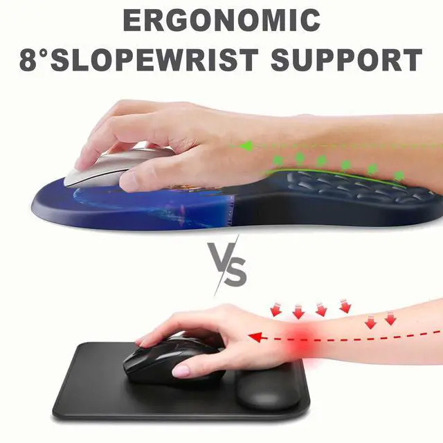 Ergonomic Comfort & SupportThis ergonomic mouse pad features an 8-degree tilt, scientifically tested to provide optimal support for your palm and wrist,effectively improve carpal tunnel syndrome.The mouse pad with wrist rest can reduce discomfort or pain during long hours of use.