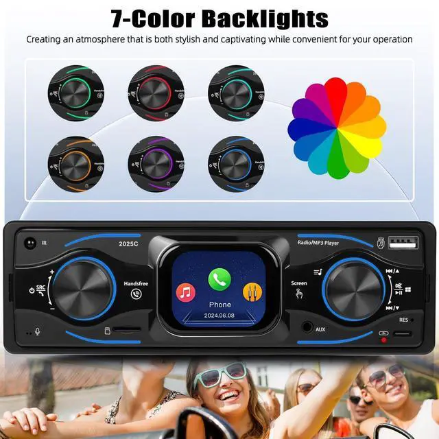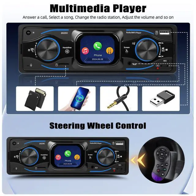 USB/Type-C/SD/AUX-IN and excellent sound qualityThis MP3 car player is equipped with front USB port/SD card slot/aux-in jack, allowing you to enjoy multi-source music freely. The car Bluetooth radio supports amplifiers and can connect up to four speakers. You can connect your subwoofer via the RCA audio out port