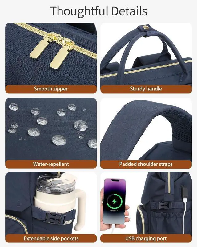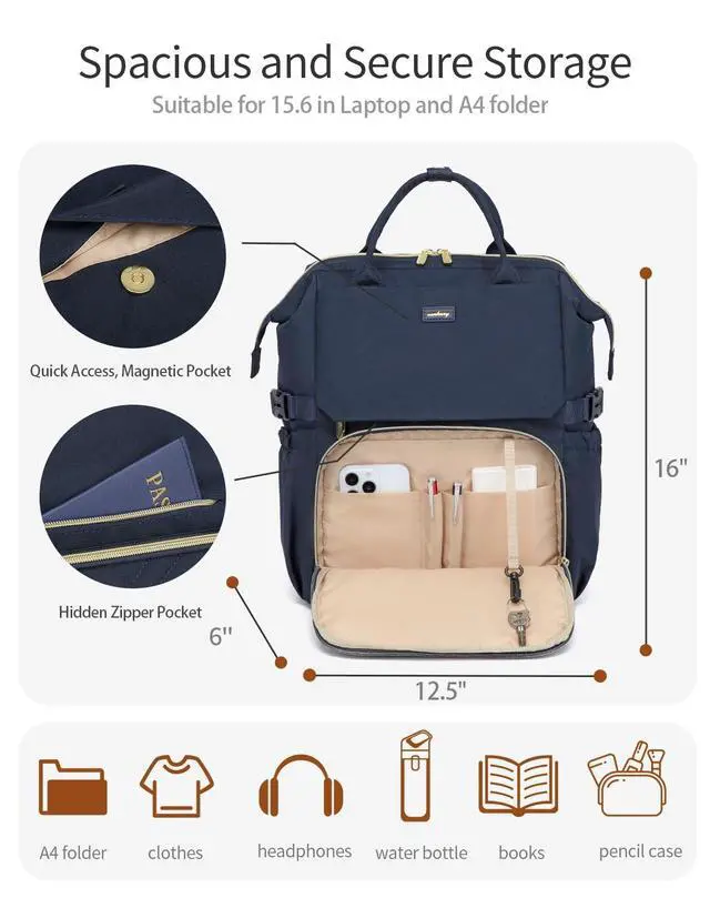 VANKANY Computer Backpack for Women, Work Bag Laptop Bookbag with Cup Holder & USB Charger for Teacher Nurse College Travel Back Pack, Gifts, Navy Blue