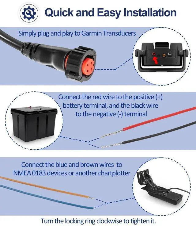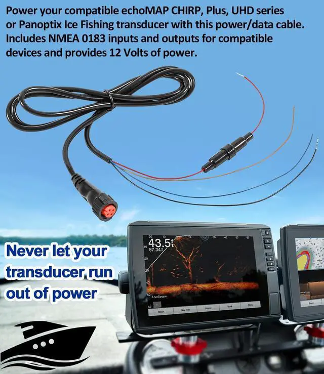 Perfect Connection: Power your compatible echoMAP CHIRP, Plus, UHD series or Panoptix Ice Fishing transducer with this 6 foot (2 meters) power/data cable. Includes NMEA 0183 inputs and outputs for compatible devices and provides 12 Volts of power.