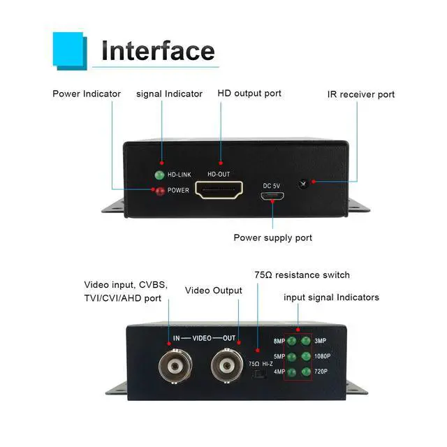 The device uses 5V/1A power supply, and power indicator stays on after the converter is powered on ^^ [ 75 and HI-Z Switch ] When the IN port of the converter is connected to the camera, and the OUT is not connected to the DVR, please set the impedance switch to 75. When the IN port of the converter is connected to the camera and the OUT port is connected to the DVR, please set to HI-Z. ^^ [ Compact Size & Easy to Install ] The size of WANLUTECH CVI/TVI/AHD to HDMI converter is 109 mm x 94 mm x 25 mm, the weight of converter is 0.18 kg.