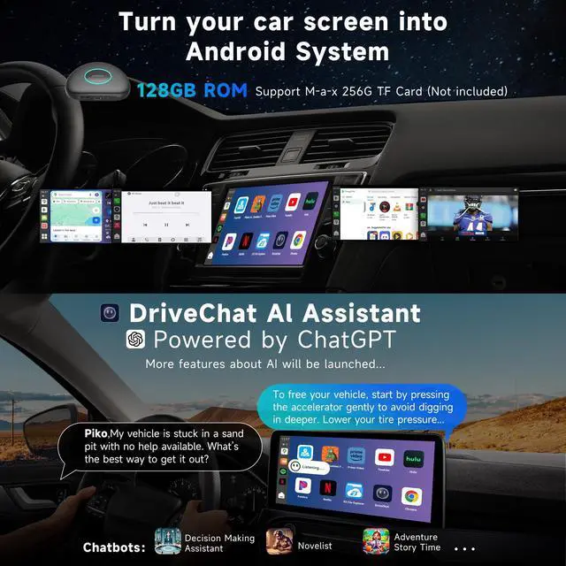 3) Not compatible with: BMW models, Most Subaru vehicles, Aftermarket head units, or OEM head units that support wireless CarPlay or wireless Android Auto only. ^^ True Independence (4G & GPS) Stop draining your phone's battery. This carplay adapter android auto device has its own built-in 4G LTE modem (supports Cloud/Physical SIM) and an independent GPS module. It stays online by itself, navigates with its own signal, and runs apps with its own power. Your car is no longer just connectedit's truly smart and independent. ^^ Drive Smarter with Your AI Co-Pilot Experience your drives like never before. This carplay AI box comes with a built-in ChatGPT-powered assistant, featuring 50+ smart skills. Just speak naturallyDriveChat AI understands, thinks, and responds like a co-pilot, making every ride smoother and more connected. ^^ 8-Core Power, Android IntelligenceExperience the peace of mind that comes with a truly stable connection. Our premium 8-core chipset and Full Android 13 system ensure smooth streaming, quick app responses, and offer you abundant space for all your favorite apps and media. ^^ Automatic Privacy Screen This is the feature no other box has.