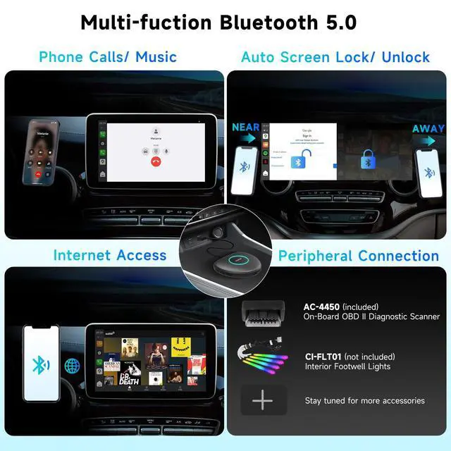 Leveraging an innovative Dual-Bluetooth design, the screen automatically locks when your authorized phone leaves the car and unlocks on return. Hand your keys to a valet or a friend with absolute peace of mind, knowing your personal accounts are completely secure. ^^ Engineered for Stability Designed for the real world, this android box for car includes a special Y-cable to guarantee stable power. This thoughtful design eliminates glitches, restarts, and disconnects that can happen in cars with engine start/stop systems, ensuring a smooth, uninterrupted experience. ^^ Huge Bonus-OBDII Scanner (Included) & OTA Updates Give live car data and instant alerts on troubles. Help in determination whether maintenance is needed. Simply connect via Bluetooth and let our skilled 'mechanic' take care of everything for you. With OTA (over-the-air) updates, your CB6 evolves over time, providing you with new features and enhanced system performance. Keep it updated with just a tap to maintain system integrity. ^^ Broad Compatibility & Seamless SetupEffortlessly upgrade your drive. This AI wireless carplay adapter plugs directly into your car's USB port, requiring no modifications or special tools.