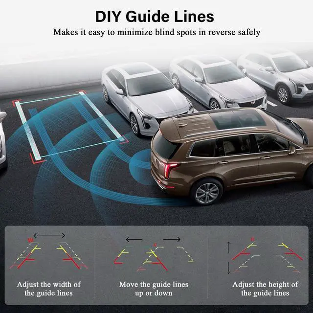 The low-light truck backup camera utilizes an extremely smart and powerful chip with superb night vision, which works reliably on cloudy days, dusk, dawn or midnight. ^^ ADJUSTABLE GUIDE LINESThe guide lines can be turned on the screen of the reverse camera for truck to help you judge the distance between your car and the obstacles, and you can also easily adjust the markers to move to the left, right, up or down according to the actual situation. You can also choose to turn it off if you want to display the screen in a simple way.