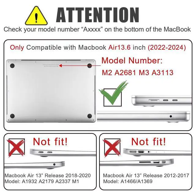 • Check Your Macbook Model: Only compatible with MacBook Air 13.6 inch 2025 2024 2023 2022 Release M4 M3 M2 Chip with Liquid Retina Display & Touch ID (Model: A3240 A3113 A2681). Please kindly check the model number "Axxx" on the back of the laptop before your purchase.