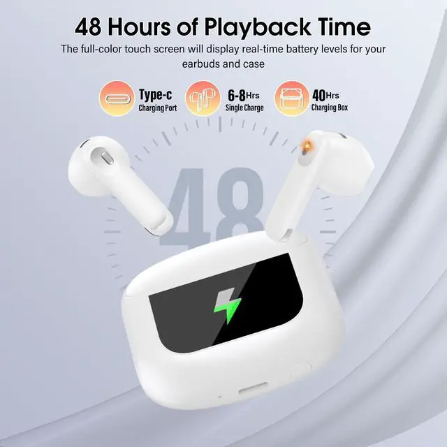 Touch Screen Earbuds: Bluetooth earphones charging case features a unique and intelligent full-color LED touch screen. You can use the ear buds or charging case to control music playback, change tracks, answer and end calls and more. In addition, the touch screen also provides a series of functions such as volume adjustment, camera control, 7 languages switching, wallpaper switching, screen brightness adjustment, headphone search, timer, etc. ^^ 48 Hours