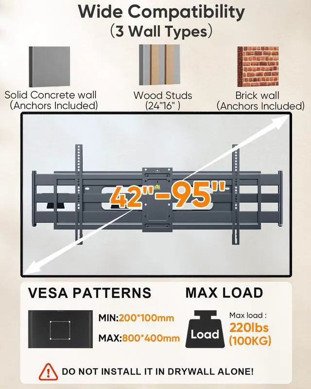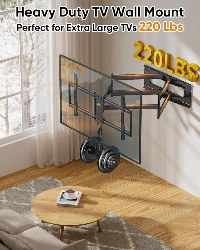 {Heavy Duty TV Wall Mount for Large TV}100% sure you would prefer a sturdy and the 86 inch tv wall mount for your expensive and Most 42-95inch lcd/led/qled/4K/8K TVs, and this long arm tv mount will be the perfect choice since it has dual articulating arms which means more stable construction and supports 220lbs tvs.
