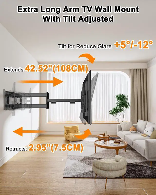 {Long Arm TV Wall Mount Bracket}Equipped with 43 pretty long extention arm, imagine your tv is mounted in your living room, but now you can watch your tv even in another room as this tv mount could extend and move side to side. The nice extra long arm tv mount 65 inch+.