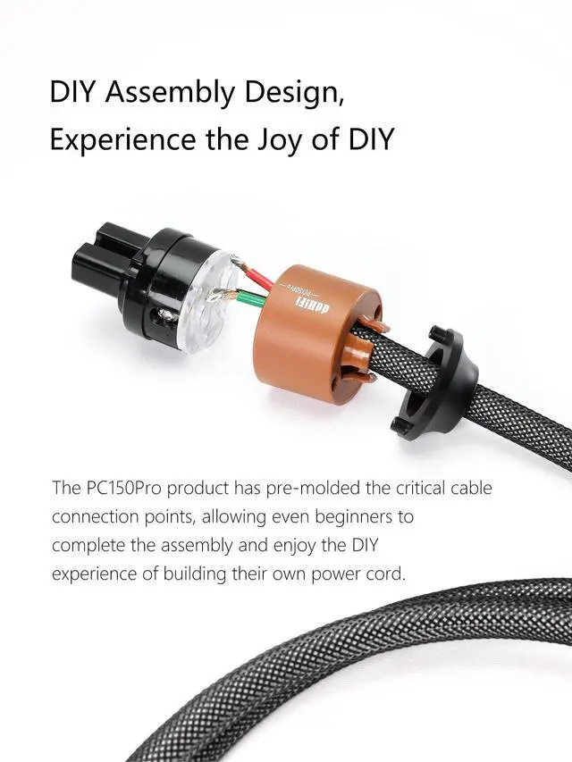 ^^ DIY fun: This audiophile power cord has pre-molded the critical cable connection points, allowing even beginners to complete the assembly and enjoy the DIY experience of building their own power cord.