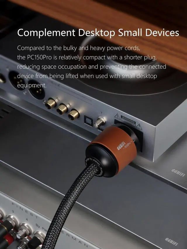 ^^ Compact and exquisite: Compared to the bulky and heavy power cords, the PC150Pro is relatively compact with a shorter plug, reducing space occupation and preventing the connected device from being lifted when used with small desktop equipment.
