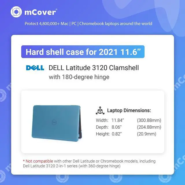 Made of high-quality translucent polycarbonate material, which is shatter-proof and will protect your 2021 11.6" (diagonal) Dell Latitude 3120 Education laptop ( with 180 hinge ) all around. ^^ Designed to perfectly fit the new 2021 11.6 -inch Dell Latitude 3120 Education laptop ( with 180 hinge ) and protect ALL corners. ^^ NOT compatible with any other Dell Latitude series ( including Dell Latitude 3120 2-in-1 series with 360 hinge) and any other Dell / non-Dell laptop models ^^ Designed with Retractable feet at the rear bottom to let you type more comfortably. It also helps to prolong your laptop's life with BETTER heat ventilation from features like retractable feet and more wider ventilation slots.