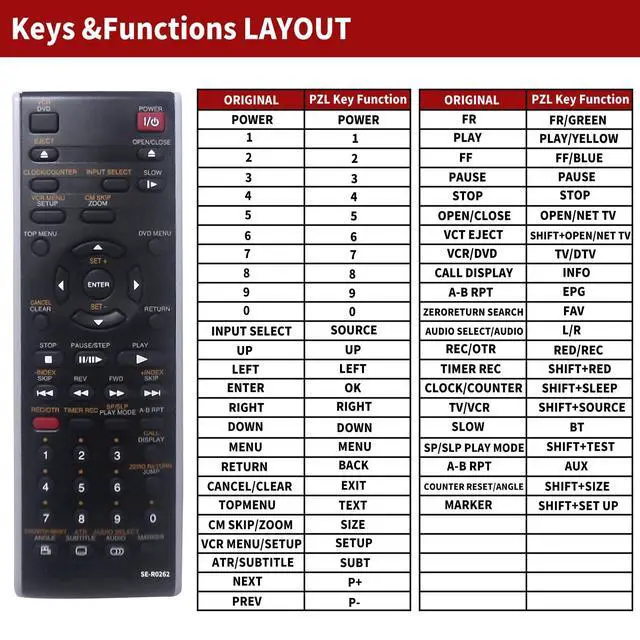 PZL New SE-R0262 SER0262 Replacement Remote Control for Toshiba DVD/VCR Combo. Package Included: 1 x IR Remote Control (Batteries and Instructions are Not Included). Compatible with Models: SDV295 SDV295KU SD-V295 SD-V295KU