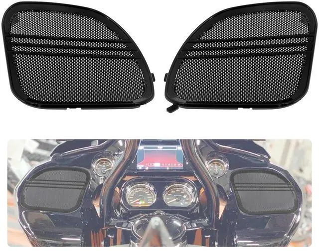 [ Fitment ] Fit for 2015-2021 Harley Touring Road Glide FLTRX, FLTRXS, FLTRU, FLTRUSE, FLTRK with original equipment or Stage I speakers. NOT fit with spectra Glo Speaker Illumination kit. ^^ [ Enhanced appearance ] simple and elegant, can not only enhance the beauty of the Harley but also bring an excellent experience. ^^ [ Easy Installation ] just attach the fork guards on to front forks. ^^ [ Material ] made of plastic outer frame and steel mesh ^^ [ What you get ] Sold in pair (left & right).