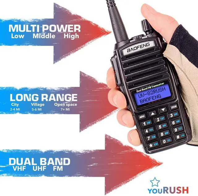 Wide frequency range: UHF / VHF radio scanner and FM band. ^^ 128 memory channels radio scanner. Easy to program with USB programming cable. CHIRP supported. CTCSS / DCS operation. Scan modes. Large alphanumeric screen. Keypad lock.. FCC Part 15 Part 97 Certified. VHF/UHF 144-148 mhz / 420-450mhz. 5 years USA Warranty & CHIRP Support & Lanyards youRUSH for yours UV-82!