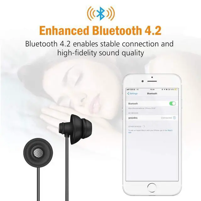 Soft and Comfortable Earplugs Noise Isolating Design--Soft and Comfortable In-ear earplug design effectively block out background noise, perfectly block out the snoring, living-room TV sound, office noise and roommate move noise and etc., protect your listening in noisy environment. ^^ 1 to 2-Hours Quick Charging For at Least 18 Hours Playing Time--GOOJODOQ wireless bluetooth sleeping headphones with improved lithium polymer battery brings up to 18 hours pleasure musically and socially with a quick charge of only1 to 2 hours. ^^ Neckband Wireless Sport Earphones--The earphones feature a flexible cable that fits comfortably around the neck.