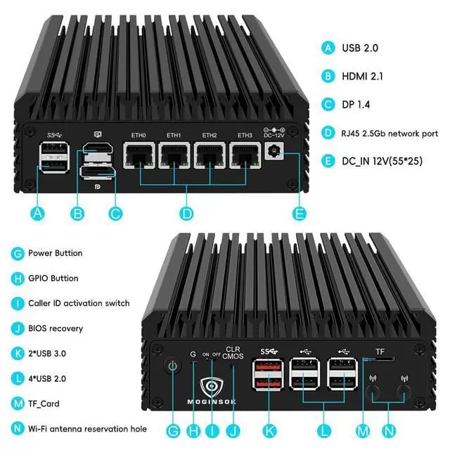Professional Firewall PC MGSRN305MOGINSOK Firewall Appliance Mini PC--MGSRN100, with Intel Processor Alder Lake-N100 (4C/4T, up to 3.4GH z) processor Intel UHD Graphics TDP only 6W, supported AES-NI With HDMI 2.1 +DP 1.4 Support Dual 4K@60Hz Display, a fanless & silent professional firewall router pc with multi-functions like AES-NI, ESXI, Watchdog, Auto power on, RTC, PXE boot, Wake-on-LAN etc. bring you a secured and encrypted network environment. ^^ DDR5 Ram & PCIE 3.0 SSDMOGINSOK Micro Firewall Appliance MGSRN100 with Barebone No Ram (1x Single slot support maximum 32GB DDR5 4800MHz) and No SSD(1*M.