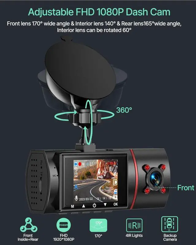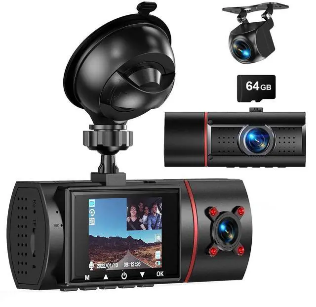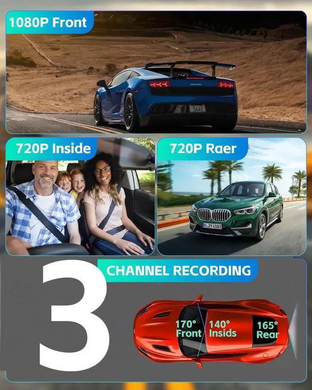 [3 Channel Dash Cam Front Rear and Inside] --- This dual dash cam front and inside features a front camera with a 170 field of view, a 165 rear camera, and a 140 interior cabin camera, providing full coverage of the front, rear, and interior of your vehicle. It captures high-quality video at 1080P for the front, 720P for the rear, and 720P for the interior, all while recording audio. The cabin camera is rotatable by 180 for optimal viewing ^^ [Dash Cam W/ 64GB Card] --- IMPORTANT!!! NO Wireless, NO APP, NO WIFI, NO GPS, NO Bluetooth.