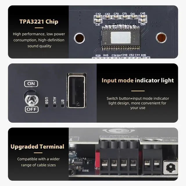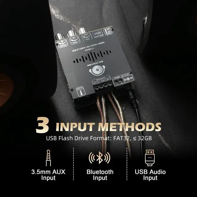 MULTIPLE INPUT OPTIONSThe T100HS supports Bluetooth, AUX, USB flash drive, and USB sound card inputs, making it compatible with a wide range of devices such as smartphones, TVs, laptops, and more. Enjoy seamless audio playback in various scenarios. ^^ TPA3221 CHIPThe T100HS is equipped with TPA3221 chips for stereo 2.0 channel output, with a maximum output power of up to 100W+100W and a wide voltage input DC of 12-30V. The large heat sink used allows the amplifier board to operate continuously and efficiently. ^^ PROTECTION FUNCTIONThe T100HS Bluetooth power amplifier board features multiple protection mechanisms, including **short-circuit protection, over-current protection, over-heat protection, and polarity inversion protection**.