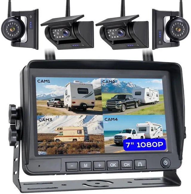 Perfect for trucks, RVs, trailers - installs in minutes with zero wiring! ^^ Crystal-Clear 7" 1080P Monitor Enjoy razor-sharp 1080p views with WOOCARTY's easy-to-use wireless monitor. Watch up to 4 camera angles at once with simple tap-switching between full-screen, split-view, or quad-view modes. Comes with both 12V DC vehicle charger and a USB power cable - power it your way! The anti-glare screen stays clear even in bright sunlight, perfect for RVs, trucks and trailers. ^^ All-Weather Night Vision Camera SystemThese four rugged cameras are built to withstand even the toughest conditions, certified waterproof to the IP69K standard for protection against heavy rain, dust, and high-pressure washes. When daylight fades, the smart infrared night vision automatically kicks in, providing clear black-and-white footage around the clock. Giving you complete visibility and peace of mind for safer driving in all conditions. ^^ Always-On Recording with Instant Playback Your drive is always protected with automatic loop recording that never misses a moment - perfect for parking incidents or insurance claims. The screen shows crystal-clear footage, and lets you instantly replay any recording right on the display.