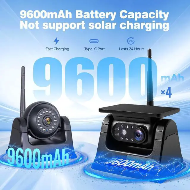 IMPORTANT NOTE: The magnetic side-view camera features a 180 rotation angle. To achieve the optimal viewing angle, simply loosen the screws under the rubber plate on the top of the camera and adjust the angle as needed. For detailed video instructions, locate the seventh image on the left side of the product page and click to watch the tutorial. Alternatively, you may contact our customer service team to request the tutorial video. ^^ 60-Second Tool-Free Installation This wireless backup camera system features a high-strength magnetic mounting base and integrated rechargeable battery, enabling secure attachment to any ferrous metal surface without requiring drilling or permanent wiring. The autonomous power supply and true plug-and-play functionality facilitate installation completion within one minute. The magnetic mounting design permits rapid relocation and reconfiguration across multiple vehicles or mounting positions. ^^ Complete 4-Camera Kit for 360 Visibility Never miss a spot with our easy-to-use wireless camera set (2 rear + 2 side cameras). Enjoy worry-free power all day with huge 9600mAh batteries that charge fast using the included 4 premium adapters (Type-C cables in box). The super-strong magnets hold tight on any vehicle, yet pop off easily when you need to move them.