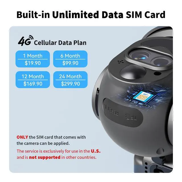 Anywhere Access: Designed for locations without WiFi, the camera features a built-in SIM card compatible with Verizon, T-Mobile, and AT&Ts 4G networks. It includes a trial data to get you started. Once the trial data is used up, a subscription to an unlimited data plan is required to continue using the service. Please note that the SIM card is built-in and non-removable, only supported for use in the U. S. ^^ Solar Charging for