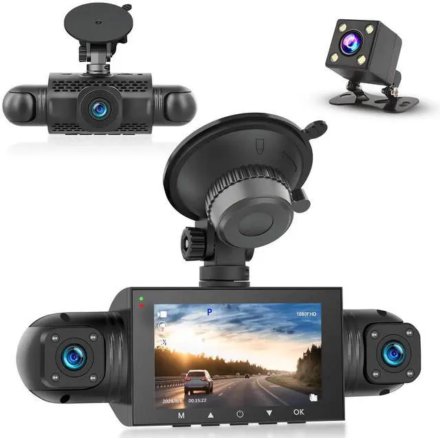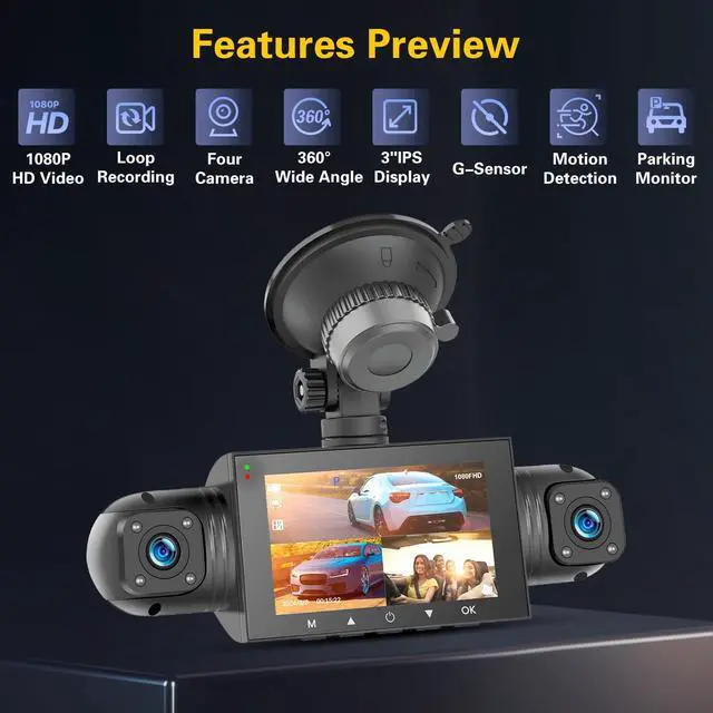 Unique Multi-Angle Adjustment: Equipped with four HD cameras, including three front-facing lenses adjustable to multiple angles, allowing you to customise the camera angles according to your needs, ensuring no blind spots around the vehicle. One of the cameras can also be aimed inside the car for monitoring children or recording the joys of your journey ^^ Night Vision Dashboard