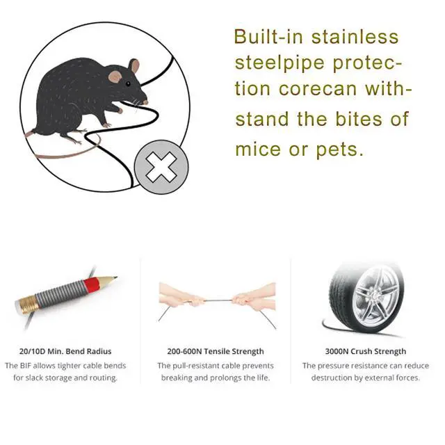 ^^ ARMORED OUTDOOR FIBER OPTIC CABLEThis lc to lc fiber patch cable built-in a stainless steel tube inside to protect the inner core (fiber glass) from damage like pet chew. it remains all the features of a standard fiber optic cable, but is much stronger. ^^ LOW SIGNAL LOSS ATT FIBER CABLEThis om3 fiber cable is designed to minimize signal loss, and high reliability, insertion loss of 0.3 dB and return loss of 30dB. Ensuring efficient and reliable data transmission.