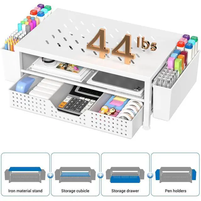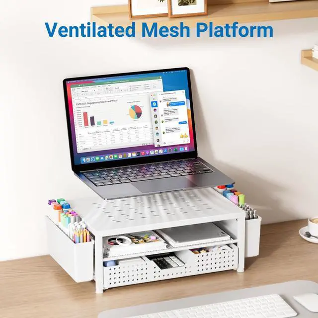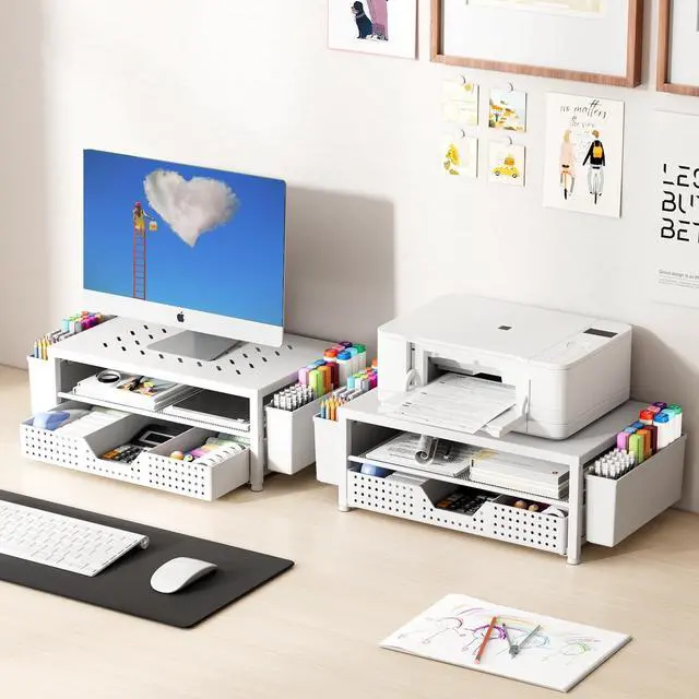 Save SpaceThis 2-Tier monitor stand with drawer and 2 hanging pen holders provides ample storage space to keep your office supplies and office desk accessories neatly organized and easily accessible, keeping your workspace tidy and improving your sense of well-being