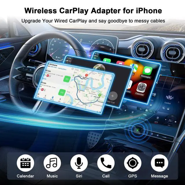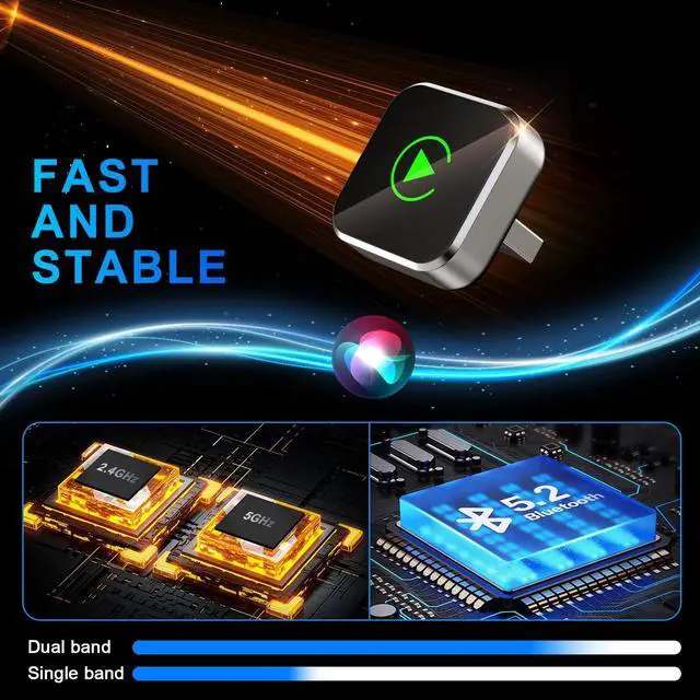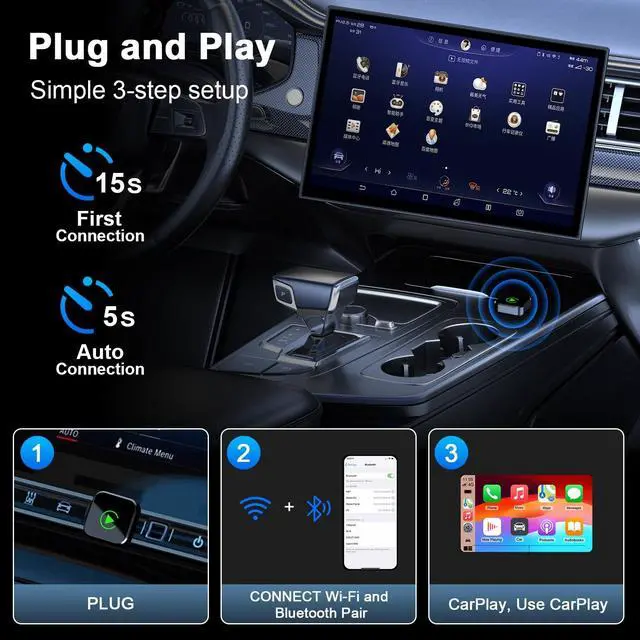 As a lowprofile wireless apple carplay adapter, it keeps your dashboard tidy without messy cables or bulk. This sleek bluetooth car adapter matches any car interior style and stays hidden while working efficiently. ^^ Super Stable & Fast Connection PerformancePowered by 5.8GH z WiFi, Bluetooth 5.3 and upgraded chip, this apple car play adapter delivers ultrastable and fast transmission. The wireless carplay adapter ensures smooth navigation, music and calls even on bumpy roads or long trips. Enjoy consistent, lagfree performance with this reliable carplay wireless adapter. ^^ Plug & Play with AutoReconnect FunctionEasy to use in seconds: just plug in, pair via Bluetooth, and enjoy wireless CarPlay at once. This wireless car play adapter automatically reconnects to your phone every time you start the car. No complicated settings, no repeated operationsthis adaptador inalambrico carplay brings you the most convenient driving experience. ^^ Online Upgrade & Reliable After-Sale SupportFCC certified for safe use, this wireless carplay adapter supports online firmware updates to keep optimal performance. Backed by 3year warranty and 24/7 support, this professional carplay wireless adapter ensures longterm durability and worryfree using experience for all iPhone users.