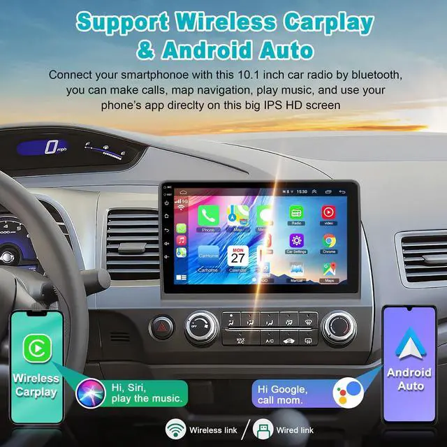 Applicable Car Models & Stereo Configuration This car stereo is suitable for Honda Civic 2006 2007 2008 2009 2010 2011. And it is equipped with android 12 system, 10.1 inch HD touch screen, 4G RAM+64G ROM, offline/online GPS navigation, Wifi connection, FM radio and we also gave away a waterproof HD rear view camera. Moreover, it supports Android/IOS smartphone mirror link, steering wheel control. ^^ Car Radio Support Wireless Carplay & Android AutoThe honda civic radio is compatible with wired/wireless carplay and Android auto. You can seamlessly use your phone on the 10.1 inches big screen.
