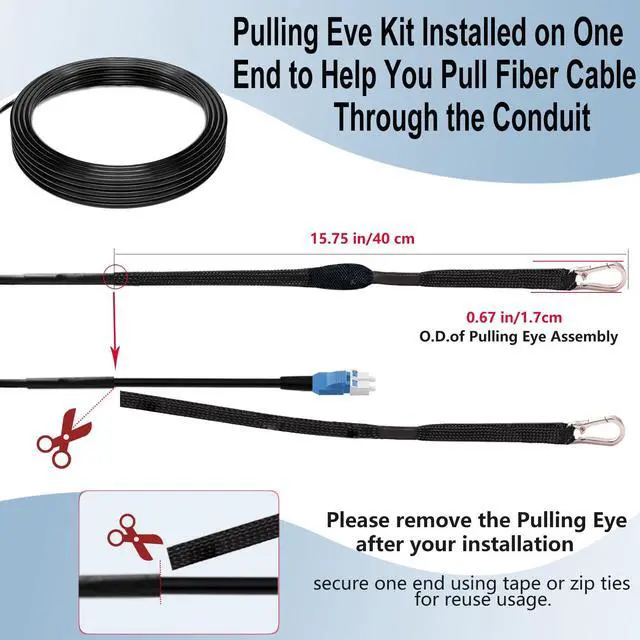 • Pulling Eye Pre-Terminated OS2 Fiber cables--- with swivel pulling eye kit installed on one end to eliminate cable damage during installation to help you pull