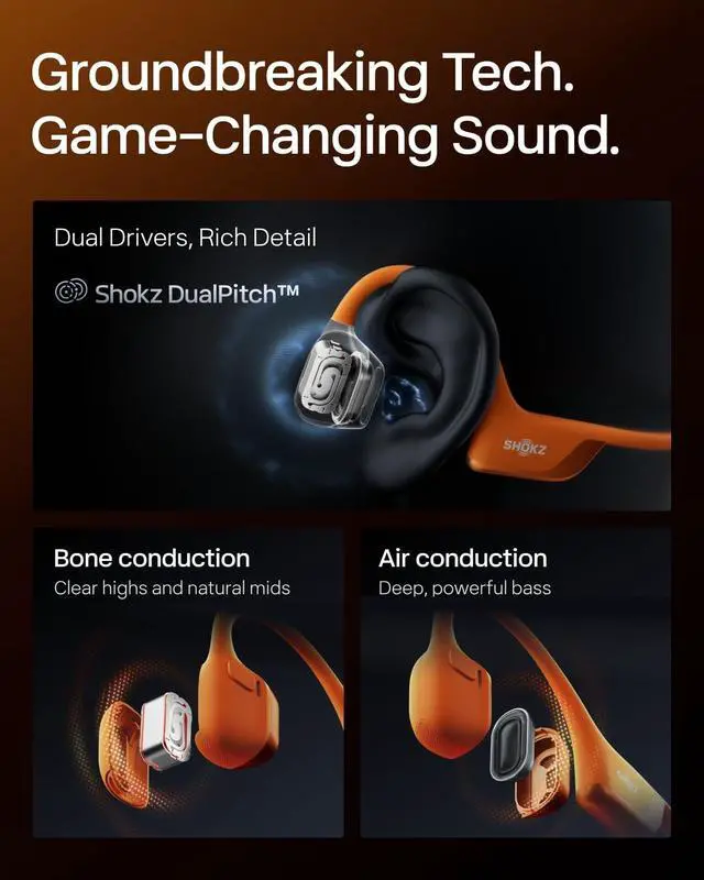Unparalleled Audio and Premium sound - Dual drivers combine the clear highs of Bone Conduction Tech with the deep bass of Air Conduction Tech for 12 hours of powerful, 3D audio. Perfect for musical motivation during workouts and runs. ^^ Open-Ear Awareness - SHOKZ's signature open-ear design helps you power through your workouts while keeping you safely aware of your surroundings. Leak-free listening ensures your audio remains for your ears only ^^ Secure Stable, Lightweight Fit - The weight-optimized design of this unibody frame integrates a Ni-Ti alloy memory wire and ergonomic ear hooks.