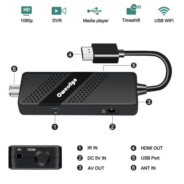 Digital TV Converter Box: 2026 OWERSLYN Mini Digital Converter Box for TV receives ATSC broadcast signals from an antenna and outputs them to a TV, Projector, or a Monitor, allowing you to watch TV programs with ease. its compact design lets you conveniently hide it behind your TV. ^^ 75% smaller than normal ATSC tuner that can be plugged into your TVs HDMl port and powered by TVs USB or 5V USB Charger, can tuck neatly behind your TV. IR infrared sensor and 2-in-1 Remote control with learning function so you don't have to use the old remote control as well.