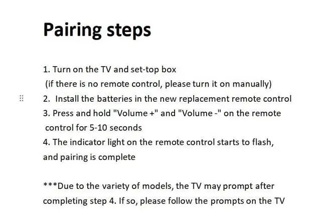 Pairing steps:1.Turn on the TV and set-top box (if there is no remote control, please turn it on manually)2.Install the batteries in the new replacement remot