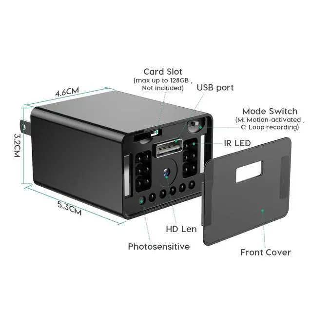 2-in-1 USB Charger CameraSeamlessly integrates a fast-charging USB phone charger with a mini full-hd camera for dual functionality