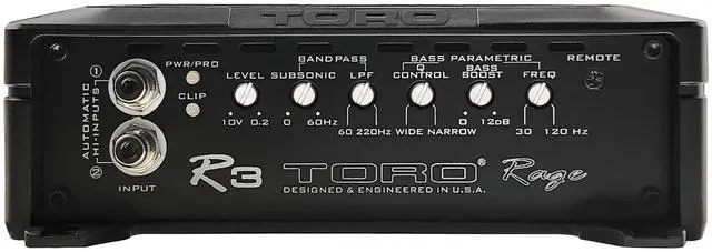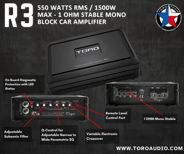 Boost your cars bass with the TORO AUDIO R3 Monoblock Amplifier, engineered for deep, powerful low-frequency performance and reliable daily use. This efficient Class-D amp delivers 550 W RMS and up to 1500 W peak power, and remains stable at 1 for strong subwoofer output. It features a variable low-pass crossover, adjustable bass boost, Q-Control parametric EQ, and auto sensing turn-on for flexible installs, even without RCA outputs. Durable MOSFET power supply and built-in protection circuitry provide consistent performance ride after ride.