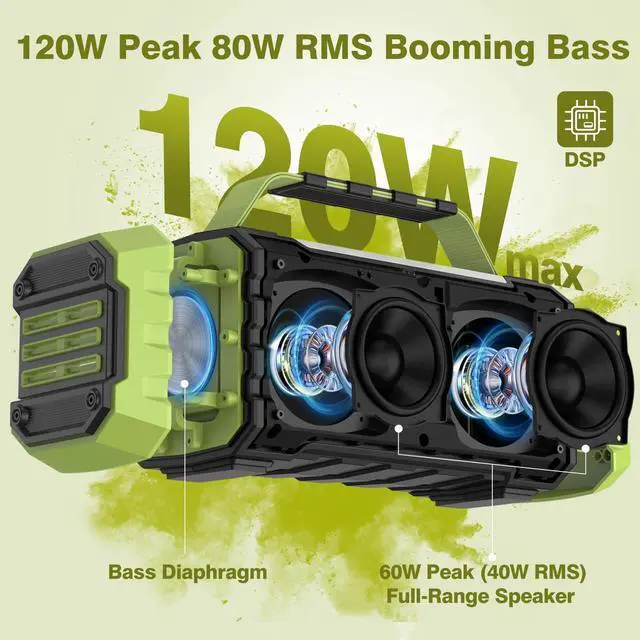 Bluetooth Speaker with BassThe K30 120W Peak Bluetooth speaker is big powerful portable Waterproof speaker, it equipped with two 3.5 -inch full-range high-performance drivers and dual bass diaphragm design, can provide very heavy bass and amazing surround stereo sound. it built-in DSP chip can faster processing sound algorithms to optimizes audio clarity, balance, and bass response for a premium listening experience. ^^ Wireless and wired ConnectThe K30 portable party Speakers built-in advanced Bluetooth 5.3 wireless transmission, working distance up to 100ft range, easily connectable all Bluetooth-enabled device, such as your iPhone, iPad, cellphone, tablet, laptop, and all other bluetooth devices.