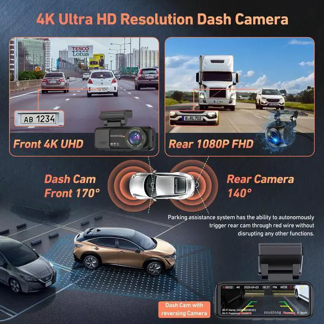 ADAS Smart Driving Function for Enhanced Safety-The dash cam stands out from the competition with its ADAS (Advanced Driver Assistance Systems) function. This car camera - dash cam front and rear can intelligently alert you before potential dangers, such as blind spot detection and lane change assist. For tech enthusiasts, this is a must-have feature. Whether you're on a long road trip or just driving in the city, the ADAS function of this dash camera adds an extra layer of safety ^^ 4K & 1080P Dual Recording for Ultimate Clarity- The dash cam front and rear offers 4K resolution for front car camera and 1080P for rear.