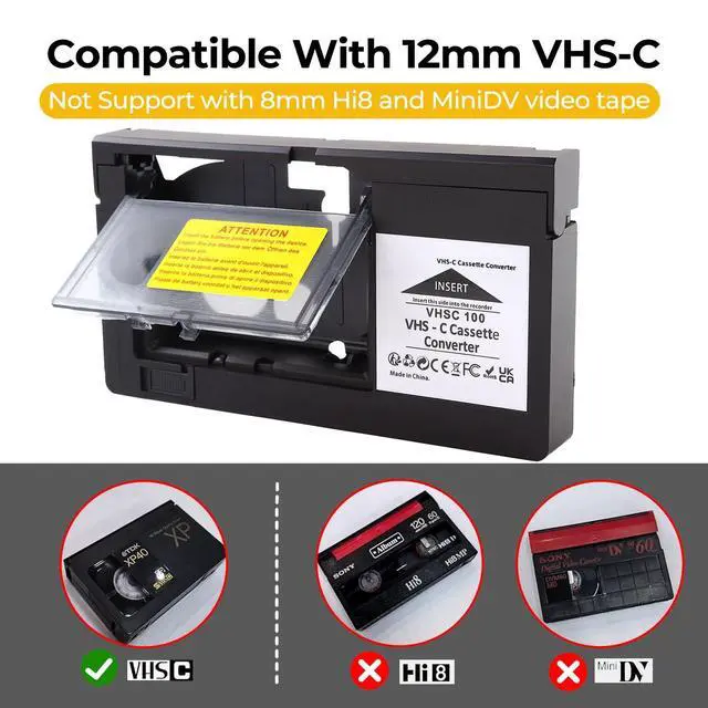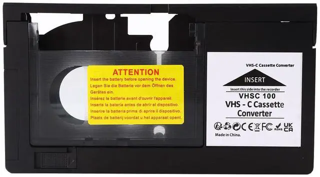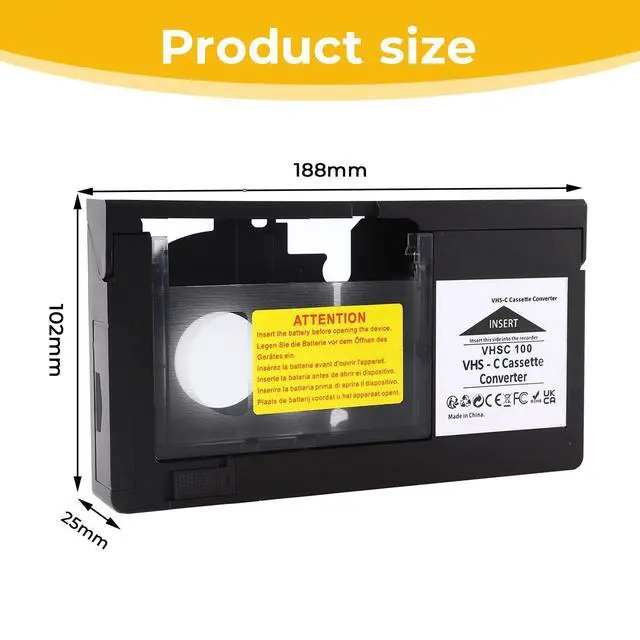 Note: This adapter is not compatible with 8mm, MiniDV, or Hi8 formats. Enjoy seamless playback of your cherished VHS-C home videos on standard VHS players. ^^ Automatic Motorized Loading - Equipped with an automatic motor, this adapter quickly loads and ejects VHS-C tapes in secondsno manual operation required. It saves you time and effort, making your viewing experience more convenient. ^^ Easy to Use - Simply insert a battery, slide in your VHS-C tape, and play it in any standard VHS player or VCR. Designed for user-friendliness, this adapter is quick to set up and use, even for beginners. Requires 1 AA Battery (not included). ^^ Durable and Long-Lasting - Built with high-quality materials for durability and longevity. Whether for long playback sessions or frequent use, this adapter maintains stable performance, prolonging the life of your VHS-C tapes. ^^ Preserve Your Memories - No need for specialized equipment to relive memories stored on VHS-C tapes. With this adapter, you can easily play and enjoy your precious home videos on a standard VHS player, giving your memories a new lease on life.