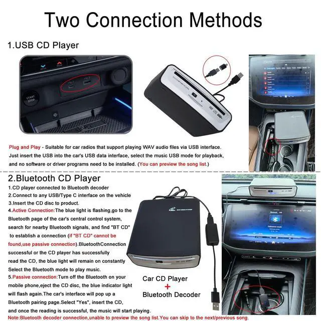 It features with new chips to strengthen its reading, anti-skip, compatibility, noise reduction, data transmission function. Restore real sound, enjoy high quality CD music and audio books. This CD player is a loyal companion to the car, allowing us to have more fun on the road. ^^ 2 Ways Connect to Car and Widely CompatibleThe portable CD player for cars is compatible with a wide range of vehicles like car, truck etc. If your car supports music files in WAV format, Use USB connection is sufficient. If not, a Bluetooth decoder can be used to play CD music via Bluetooth connection.
