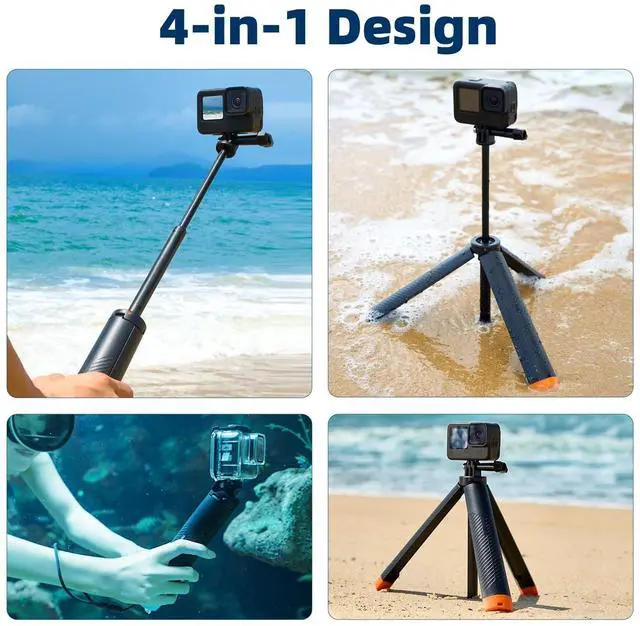 Wide range of uses: This waterproof selfie stick adopts a telescopic design, with a length of 8.6 inches-24 inches (( 22cm-61cm )NoticeThe bottom interface features a 1/4-inch screw, can be connected to extend the length). When you don't need to use the selfie stick, you can shrink it to 22 cm and it can be easily put into a backpack ^^ Portable & Convenient Floating Tripod is made from aluminum alloy, which is not easy to rust and corrode. Weighing only 145 grams, it is compatible with devices up to 200 grams. The orange base is very eye-catching. The high visibility orange cap piece is easy to spot and retrieve in the water ^^