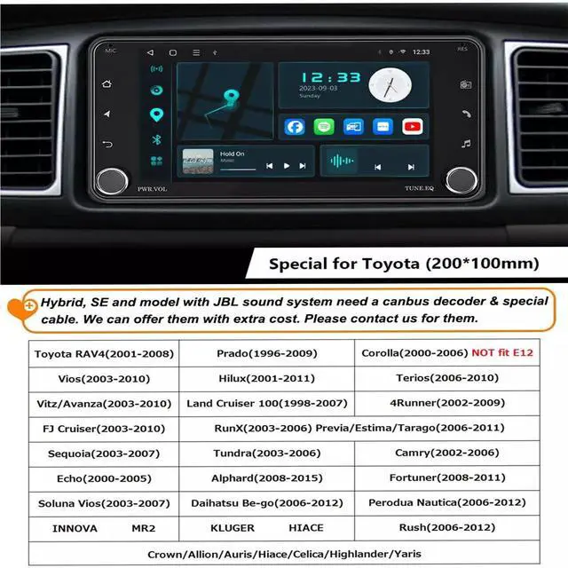 Fitement: The 7inch car radio stereo is fit for RAV4 2001-2008, for Prado 1996-2009. for Corolla 2000-2006, for vios 2003-2010, for Hilux 2001-2011, for Terios 2006-2010, for Vitz/Avanza 2003-2010, for Land Cruiser 100 1998-2007, for 4Runner 2002-2009, for FJ Cruiser 2003-2010, for Sequoia 2003-2007, for Tundra 2003-2006, for Camry 2002-2006, for Echo 2000-2005, for Alphard 2008-2015, for Fortuner 2008-2011, for Soluna Vios 2003-2007. ^^ with Carplay & Android AutoThis car stereo for 2007 4Runner is susport with Carplay and Android Auto, allowing you to connect via Bluetooth and Wi-Fi to display your smartphones content on the large screen. You can use Siri or Google Assistant to make calls, navigate, play music, and manage other applications easily. ^^ GPS Navigation & WiFiThe 7-inch radio for Sequoia 2008 features a dual navigation system that supports both offline and online maps, ensuring safe driving even in areas with weak mobile signals. Additionally, connecting to Wi-Fi allows you to access various phone features directly on the with Carplay stereo screen for added convenience. ^^ Bluetooth & FM Radio The upgraded radio for Tundra 2006 enables hands-free calling and music playback via Bluetooth.
