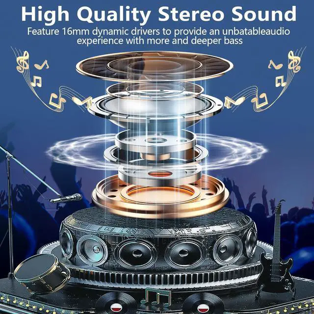 Powerful Stereo SoundBluetooth earbuds equipped with 16.1millimeters vibrating diaphragm speaker drivers, delivering sound with strong bass, clear mids, and bright treble. The built-in microphones ensure high-quality call